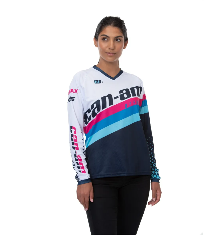 Ponte el maillot Can-Am Emblem para mujer y te sentirás preparada para enfrentarte a cualquier terreno. Los llamativos gráficos sublimados en el pecho y las mangas atraerán todas las miradas, mientras que el tejido de poliéster de secado rápido que absorbe la humedad te permite mantenerte fresca y seca en plena acción. El tejido de malla bajo cada brazo ofrece ventilación adicional para los días calurosos en el sendero.